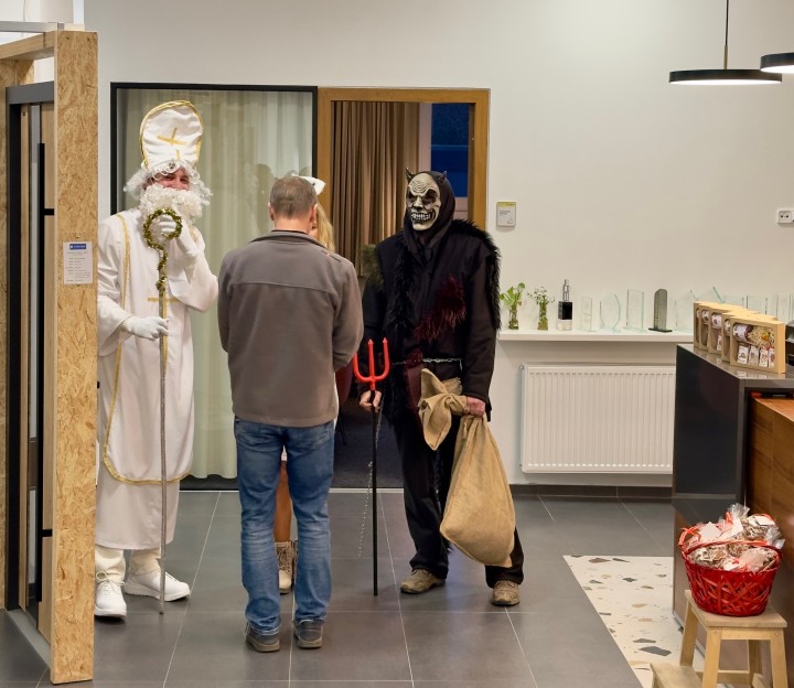 Dnes do naší firmy zavítal svatý Mikuláš s andělem, ale i čertem. Naši kolegové od prvních dvou jmenovaných dostali drobné dárečky, čert však příliš práce neměl – už z toho důvodu, že všichni naši kolegové jsou šikovní, a tak je nemusel moc kárat, natož aby si je musel vzít s sebou do pekla. Tato pohádková trojice k nám do firmy přišla vůbec poprvé a jak je vidět na fotografiích, určitě se jí u nás líbilo